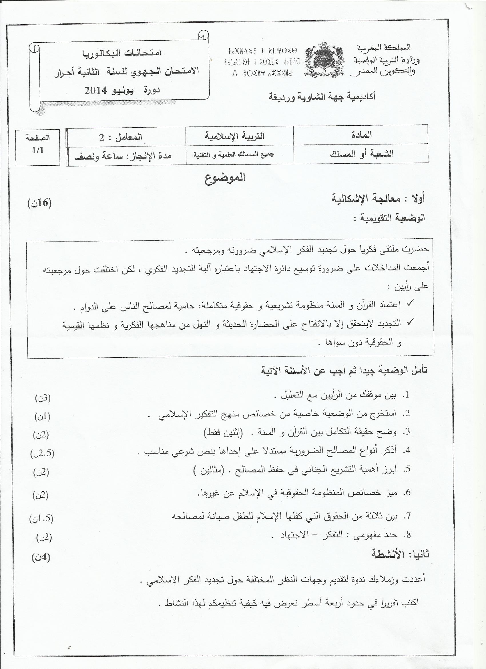 الإمتحان الجهوي للأحرار التربية الإسلامية